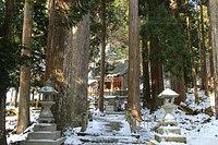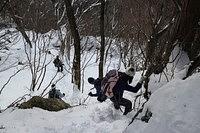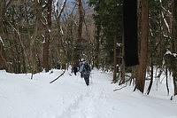 集落から登山口のある大皇器地祖神社へ向かった。コンクリートの舗装された緩やかな勾配の参道を上がると、鳥居があった。由緒ありそうな神社をみやりながら、山道に入って行った。 すぐさま歩きにくい雪に見舞われた。御池岳から眺めた天狗堂の急峻な姿からして覚悟をしていたが、いきなり雪の急登には閉口した。しばらく登ったところで、トップはワカンの着用を強いられた。一気に登り詰めて、稜線に出て一息ついた。稜線歩きをひとしきり楽しんだ後、岩が点在するようになり、再び急登となった。頂上にある大岩は、雪に埋まっていた。これ以上進むには積雪量が多く、引き返した。