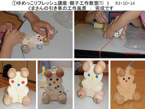 今回は、上半期予定だった子育て総合支援センター「ゆめっこ」の第1回目リフレッシュ講座で親子工作教室を開催いたしました。「くまさんの引き車」の工作です。