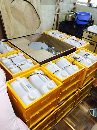 (田中会長が水を入れては詰め入れては詰め!続いてA氏が詰めては入れ詰めては入れ!)