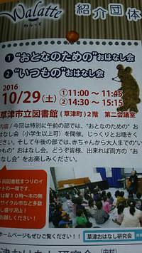 2016年09月07日 Walatte(わらって)(#^^#) 草津おはなし研究会 • 草津市 詳細 取材・記事 図書館まつり、笑って、おはなし会 お気に入りに追加 少し先ですが10月29日(土)草津市立図書館本館で図書館まつりがあります。その告知をWalatteにして頂きました。おはなし研究会のメンバーもおはなし会や、ボランティアスタッフとしてお手伝いさせて頂きますぜひ、お越しください この記事を報告する 不適切な内容や規約違反を発見した場合はご報告ください