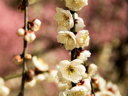 園内の梅は細長い曲線を描いた茎の先に、ピンクや赤色・白色の梅の花が色とりどりに見頃を迎えていた。多く立派なカメラを持った写真愛好家をはじめ、自撮りしている女性グループ、家族連れが押し寄せていた。そんな中に混じって、我クラブのメンバーにも出会った。写真教室のツアーに参加していたようだ。