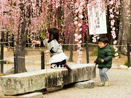 枝は、幼い女の子の手が届くところまで、しなやかさに垂れ下がっていた。目の前の花びらを触れてみたい衝動に駆られ、その姉の行動を見ていた弟が駆け寄ってきた一コマ。慌てたのは、お母さんだった・・・・・・。ほんの立ち話をしている隙の出来事だった。