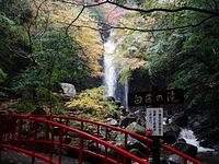 赤い橋が川をまたいで架けられていた。ここから特別なところであると強調したいのか、丸く反った太鼓橋が据え付けられていた。滝は、垂直に切り立った断崖の落ち口から真っ直ぐに落ち、両側の木々は、聞いていた通り紅葉していた。