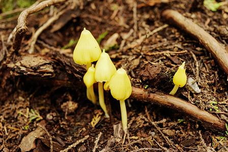 Sさんが、倒伏した樹木もそのまま放置された木陰から、指をさした。 「黄色いキノコが・・・」と。