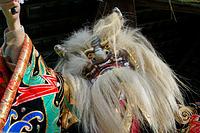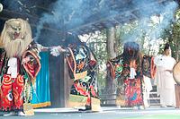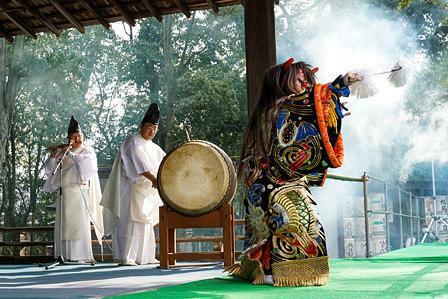 10時前には境内には人影も疎らだったのに、祭典の時間が近付くにつれて、人だかりになった。 境内に優雅な笛の音と力強い太鼓の音が響きわたると、舞台に三人の鬼たちが現れ、「鬼の舞」が披露された。