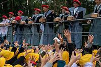 再び、赤い頭巾をかぶった福男・福女による特設舞台から豆撒きが始まった。今年還暦を迎えた年男・年女は、遠くに撒けないとの予測通り、帽子を差し出すと、「どっと」入れてくれた。