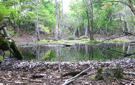木々が水面に映る幻想的な様子は以前と少しも変わりなかった。変わっていた点は、以前はモリアオガエルの卵が水面上にせり出した木の枝に白い泡の卵が付いていた。今回は、産卵した気配はない。まだ繁殖時期になっていないのだろう。モリアオガエルの姿が見えないが、あちこちから静寂を打ち消すようにしきりに鳴き、辺りに響いた。もう直ぐに恋の時期になるのであろう。