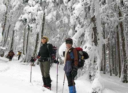 我々3人は早朝から新快速に乗り込み京都を経由して集合場所JR山陰線八木駅に向かった。ここで、「希望が丘」で時折出会う「新ハイ」のメンバー7名と合流した。 このコース、季節が穏やかな春秋は歩行時間5時間半の楽しいハイキングコースである。だが、様相は一変していた。装備は、「ワカン・アイゼン・スパッツなど完全冬山装備でお願いします」との指示通り、ここ地蔵山一帯は、枝が折れんばかりの樹氷になっていた。