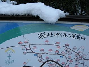この近くに「愛宕山を仰ぐ花の里越畑」と題した看板があった。春にはこの里山には「なたね」の花が咲くのであろう、この花と一軒ごとの家の名前が小まめに描かれていた。そして、丁寧に芦見谷への道まで示してあった‥‥。この案内板、上手ではないが、ほのぼのとしたものであった。