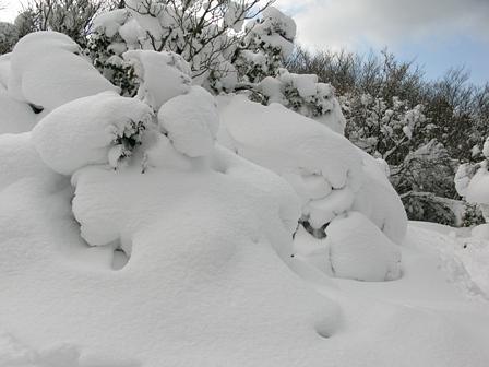 小枝が雪の重みでたわみ、いたるところで垂れ下がっていた。木から雪を叩き落とすには、余りにも多い。仕方なく小枝の下をくぐった。四つんばいで這うようにしなければ進む事ができなかった。樹上の雪と戦いながら何とか樹林帯を通り抜けていった。