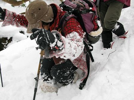 標高差160mほどの東斜面を滝谷に向かった降下していった。この斜面には潅木林がびっしり生茂っており、直線的には進めない。木々の間を縫う様に進んだ。急傾斜に積った雪は滑り落ち、小枝にストックが引っかかり、四苦八苦。全員雪まみれになって、滝谷にたどり着いた。