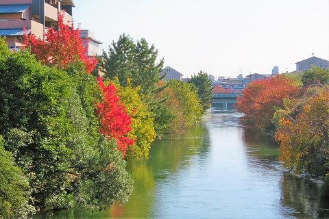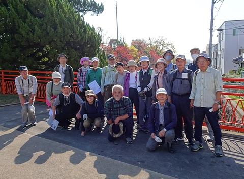 一部紅葉が始まっている疏水を南下し、新十条通・高松橋近くの鴨川運河公園で集合写真です。