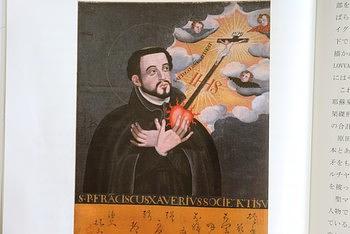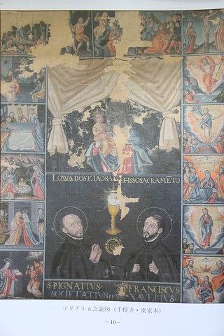 「マリア十五玄義図」と呼ばれるもので、和紙に、左にイエズス会の創始者イグナチウス・ロヨラ、右にフランシスコザビエルが描かれ、周りに喜びの玄義、苦しみの玄義、栄えの玄義が描かれています。