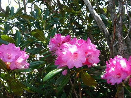 堂満岳頂上近くになって、華やかな色合いが見え隠れしてきた。シャクナゲの群落するところに来たようだ。つぼみは真っ赤であるが、開花すると淡いピンクの花であった。この種類はホンシャクナゲで、滋賀県の花である。今ではシャクナゲを保護するため、登山路も整備されているが、 35年当時、比良の尾根を背にした縦走路には、いたるところにシャクナゲ木が繁茂していた。この枝が幾重にも倒れかかり行く手を阻まれ、難儀したことが懐かしい。
