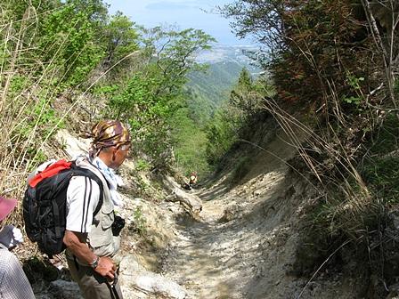 青ガレは下山時確かに注意が必要だが、踏み固められ浮石も少なく、それほど問題もなく通過できた。だが、危険の立て看板がある以上、自己責任で通ることだ。この日も、シャクナゲを目当てに来ていたグループは、青ガレを避け、北比良峠からダケ道を通って下山していった。