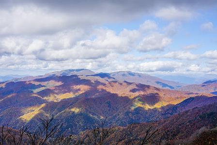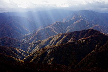 ふと気づくと、所々雲の間から僅かな太陽光が差し込み、幾重にも連なる山並みが、パッチワークのような絵模様になっていた。何だか動く気配も。