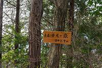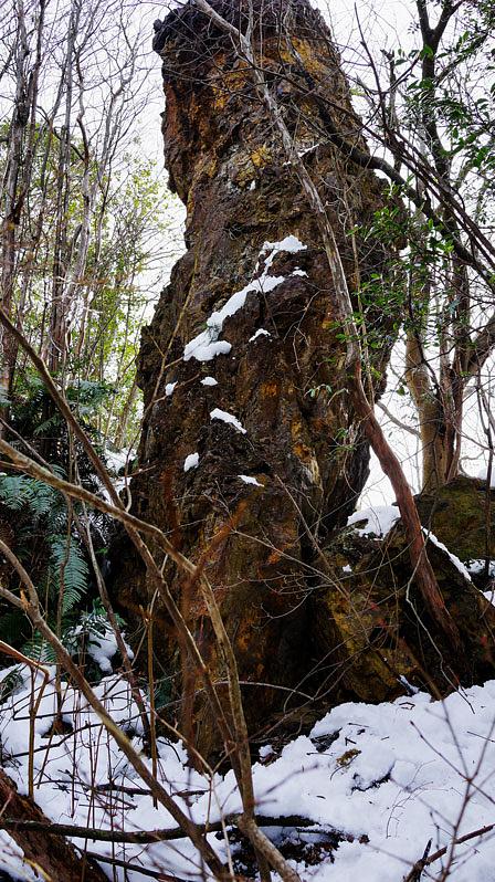 人が滅多に入らないルートだが、木に赤テープがしっかりと取り付けられていた。積雪で歩きにくい山道を登りつめていくと、昭和58年の白色の標示杭が打たれた4等三角点に出合った。山頂らしきところに点名笹尾ケ嶽(P242.9)の表示札があった。古図ではこの辺りをそう呼ばれていたようだ。さらにうねうねと続く尾根筋を辿っていくと、待望の棒状の奇岩が現れた。谷側に回り込むと、高さが10mほどあった。