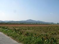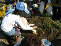 更に、建て込んだ民家を通り抜けると丘陵地帯が広がっていた。勾配の付いた斜面には、果樹園になっており、ぶどう・梨・柿などの色々な果物を栽培されていた。そうこうしていると、山之上竹山農園のサツマイモ堀の垂れ幕が目に入った。「ええもんポイント④」の引換券を渡すと小型スコップと袋が手渡された。芋を手にしてアグリパーク竜王を目指した。峠を越えて上り返すとそこがアグリパーク竜王であった。ここで「ええもんポイント⑤」氷結竜宝をもらった。乾いた喉には、冷たいぶどうは美味しかった。