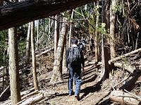 高塚山485mには三角点があったが、醍醐山454m・行者ヶ森440mの頂上の標示板は、一ヶ所でなくあちこちに見られた。この一帯の地形は、なだらかなのであろう。目印となる特徴も少なく、踏み跡もままならない雑林帯であった。その上、台風で人工林の倒木もそのまま。下見を2回も行ったリーダーは、尾根筋らしきところをひたすら辿り、最後の東総合支援学校へ、巧みに導き無事下山をさせた。ただただ、ご苦労さま。