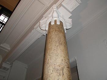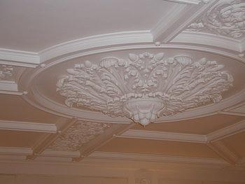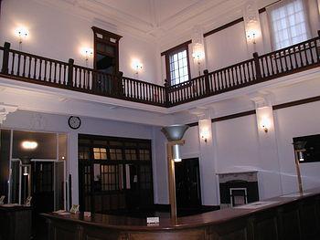天井には豪華な漆喰模様を施す一方、建物外観は茶系のタイル貼りで西洋の古典主義的デザイン。国の登録有形文化財として保存されています。