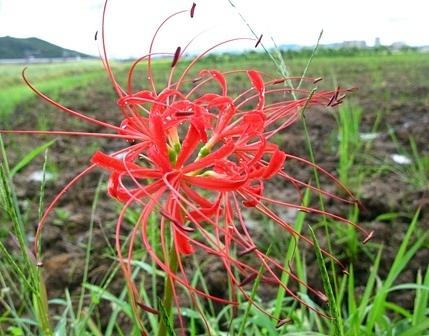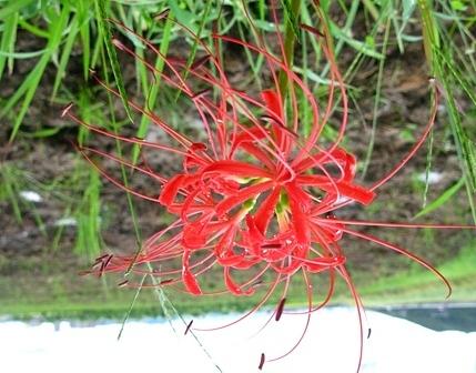 この花は、列をなして群生しているのになぜか一輪だけ咲いていました。葉のない茎が伸びその先端に深紅の花が付いています。このように異様な雰囲気をかもし出す姿をしています。お彼岸で墓参りするとお寺の境内に咲いている事が多く、不吉であると忌み嫌われるようになりました。