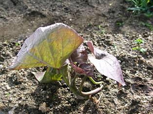もうひとつ、イモ類は弱酸性側の土を好むことを知っておくべきだ。ジャガイモ・サツマイモ・サトイモの畝作りでは、石灰をやらないで耕している。そうして、肥料を吸収する力が旺盛なので、ツルボケを起こさないように元肥は控えめにしている。無論追肥もしない。この点も大事なことである。