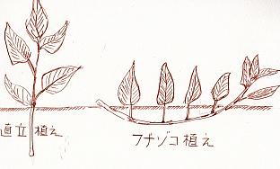 サツマイモは、苗を垂直に土にさす様にせず、葉っぱだけ地表に出して茎を埋め込むようにした「フナゾコ植え」をしている。