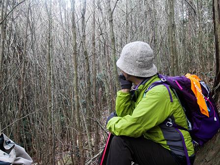 山城と鏡山の縦走路間で、若木のリョウブが山腹を埋め尽くしていた。芽生え前の木だが、樹皮は薄く剥がれやすく、剥がれたあとは滑らかな薄い茶褐色となり、木肌の模様が面白いので、名前がすぐに判った。