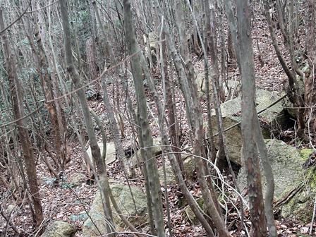 この一帯は、風化しやすい花崗岩からなり、地滑りしやすい地形である。縦走路の尾根筋で、台風や大雨により多量の土砂崩壊が発生したのだろう。山崩れの証として、緩斜面に大石がかなり堆積していた。