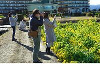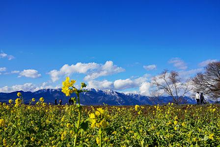 菜の花畑を背にして比良山系の山々が見え、冠雪の山々と黄色の菜の花の絨毯が絶景を生み出している。週末には、黄色に引き寄せられるかのように大勢な人がやってくる。地域興しの菜の花畑は「黄色い花」でなく「菜の花色」という固有の呼び名もつけられているぐらいだ。