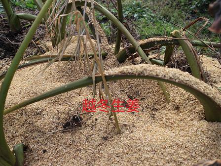 サトイモの畝には、枯草などを多量に株元に敷いている。同様に生姜も乾燥に弱いようである。共に、湿り気のある土壌を好む植物である。つまり、コンパニオンプランツの(共栄作物、共存作物)関係と云うのでなく、夏場の"かんかん“照り時に、サトイモの葉陰が生姜にとって心地よい居場所なのであろう。同様に、キューリやトウモロコシなどの草丈の高い野菜の日陰もよさそうだ。
