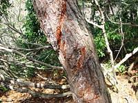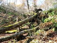 この辺りはブナ、ミズナラ、アシュウスギの混生林で、 原生の自然を感じさせる尾根歩きであった。登山路の両脇には巨木が次から次に現れ、この中でも大型巨木をよく眺めると、立ち枯れていた。たまに老木であるが僅か一部の枝に葉っぱを付け生きながらえている幹もあった。