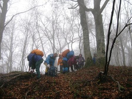 先行してルート探しをしていた時、右手の藪で異常な速さで横切って行くものがあった。どうも、動物の生息地に入り、邪魔をしたようだ。大声を出して相手側に存在を知らしめた。この辺りは、熊の爪あとの付いた幹があっちこっちにあり、原生の自然林であることが分かった。
