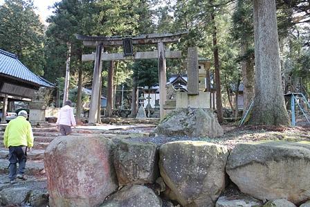 平吹の集落を通り登山口の日野神社に向かった。境内に大きな石積みがされ、由緒ありそうな神社であった。昔、朝廷から重視されたことを示す格式は、郷社、式内社である。このことは、古来より霊験が著しいとされる名神を祀られているところである。また頂上には日野神社の奥宮が祀られていることから、日野神社は日野山を信仰する中心的な役割を持っているのであろう。 今日の山行の無事を祈願して出発していった。