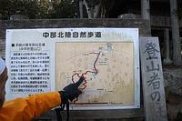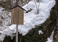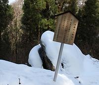 登山路は境内の左にある中部北陸自然歩道(中平吹登山口)と書かれた表示板から延びていた。出足では雪がなかったが、やがて白い道となった。山道の脇には、少し変わった岩があると立札が立てられていた。「焼餅岩」「石の唐戸」と「弁慶の三枚切の岩」と。各札には歴史的謂れの能書きが付けられていた。登山者が飽きないようにと、色々配慮が行き届いていた。