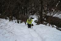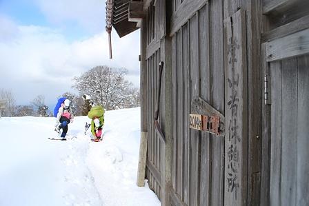 主に古道を進んだ。昔から使われていた山道なのであろう。古道1・2.・・・と番号が付けられた標識が立てられていた。この古道を交差するように、3m程度の林道が、頂上まで続いていた。自動車も登っていけるように、緩い勾配になるようにジグザグに付けられていた。したがってトレースは古道を進んでいたかと思っていると、林道になったりとお互いに入り組んでいた。いずれにしても、雪山の勝手がわからない山なので、地元の人達が付けられた道筋に忠実に従った。程なく立派な仏像のある室堂についた。