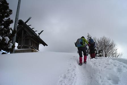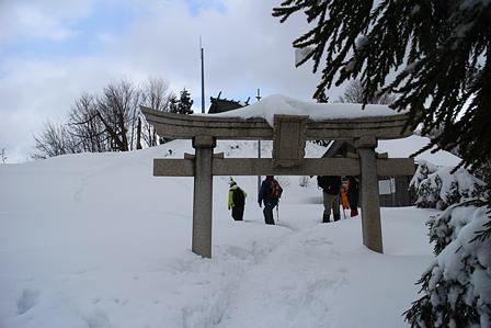 「あと50mで頂上」との表示板に導かれて、山頂広場の一角にでた。ふもとから眺めていると、雪らしきものも見えていなかったが、頂上直下の奥の宮鳥居までやってくると光景が一変していた。この鳥居を潜るには、腰をかがめてなければ、通りきれないほど、積雪があった。2メートル以上であろう。山頂の立派な奥社まで登り切った。この平吹コースの所要時間は2時間であったが、積雪で歩きにくいこともあって3時間要した。