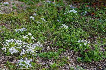 夏の蒸し暑さが残る庭に姿を見せなかったこの花は、秋の気配とともに芽吹き始めました。寒さが増すにつれ、高さ10センチほどの可憐な姿で、ハコベとともにカーペットのように広がっていきました。