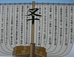 この無賃橋について、高宮:犬上川の広重画『木曽海道六拾九次』に当時の川渡しの様子が描かれている。大きな荷を背負う嫁と姑の後に、門型の仮橋が何本も描かれている。常時は橋板を外していたが、増水して渡る事ができない時、仮橋に板を架けたと言う面白い絵図を江竜氏から教えてもらったことがある。