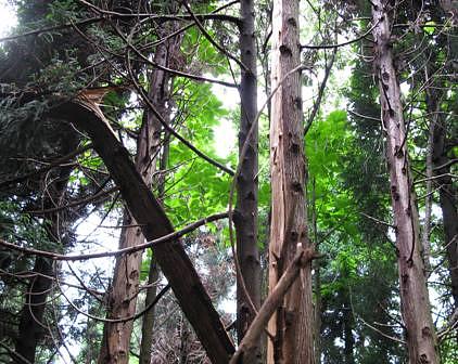 それにしても、樹木がいたるところで、裂け傷を負い、痛々しい姿を曝していた。このあたりは豪雪地帯でもあり、雪の重さに耐えかねて破損したものだ。今年の積雪量は、尋常でなかったことを小生、身を持って体験してきた。樹木を覆い隠すほど纏わりついた雪は、被害を一層大きくしたのであろう。