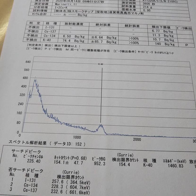1時間の測定の結果、グラフにとくに山も見当たらずセシウム137、セシウム134、ともにピークも無く、不検出と判断しました。
