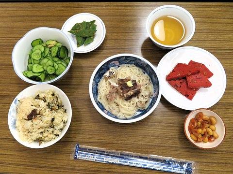 前もって配布された鮎ご飯、えび豆、丁字麩のからしあえ、鯖缶そうめんに必要な食材を、クラスの有志が調達、またお米、そうめん等も有志の方々が寄付され、食材がすべて揃いました。