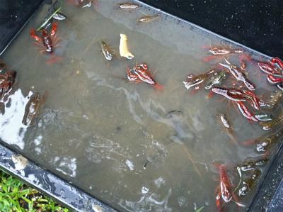 ザリガニがたくさんつれました。タモ網ですくうと水生昆虫もたくさんいることがわかります。