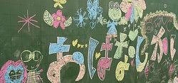黒板に「おはなし会」の文字とお花や蝶々などたくさんの絵で