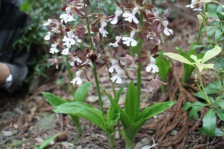 昼食後雲行きも怪しなり、小雨がパラついてきたので、休憩もそこそこにして下山にかかった。遠足尾根の杉植林帯の急傾斜をジグザグに下って行くと山野草に出会った。見た瞬間、エビネと分かった。
