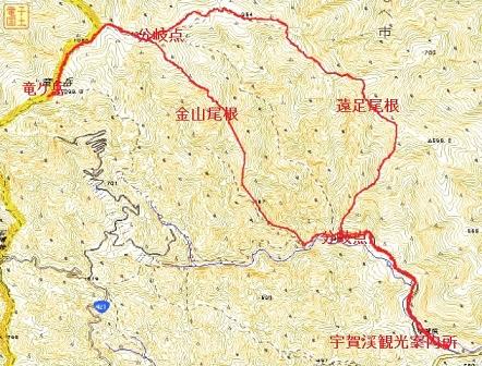我々も宇賀渓のキャンプ場の橋を渡って、車道を進み魚止橋を渡り、金山尾根登山道の取りつきから頂上を目指した。宇賀渓観光案内所で貰った子細に書き込まれた「