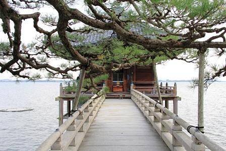 それは柴野大徳寺派の禅寺で、海門満月寺と称し、十世紀のおわりに横川の僧都(そうず)恵心が、湖中に一宇を建立(こんりゅう)し、千体仏を安置したのにはじまる。竜宮城の門によそえた小さな楼門のところで、住職が一行を出迎えた。松の影に充ちたせまい庭先に、すぐ湖へ突き出た浮御堂へ渡る橋があった。阿弥陀仏千体の半ばは、湖へ向かって、暗い御堂のなかに簇立(むらだ)ち、そこの欄干からは、対岸の長命寺や、遠く近江富士を眺めることができた。