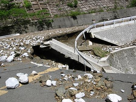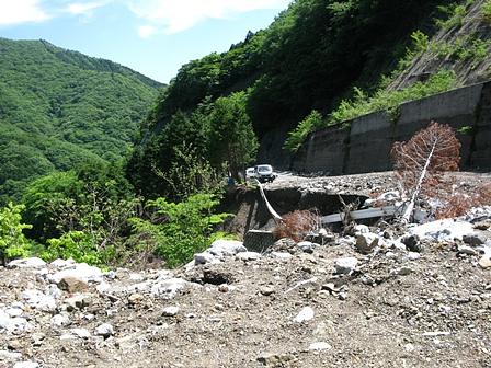 滋賀側のトンネルまでは通行可能だが、三重側の道路上には土石が散乱し、路肩の路盤の土が大きくえぐり取られていた。崩落の復旧工事も遅れ気味で、開通はいつになるか判らないようだ。