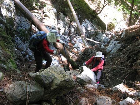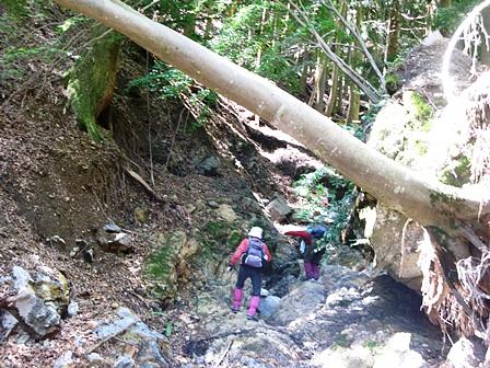 谷底の土砂はほとんど流され、堆積していた小石も無くなり石灰石の露岩がむき出しとなっていた。また両脇の土壌もえぐり取られ、各所で倒木がひどい。 コグルミ谷はほんの少し右側にわん曲しているのだが、前進できるところを探しながら登って行った。20~30分進んだところで、コグルミ谷の右岸尾根筋に入ってしまったことに気が付き、左側の谷筋に降りようとしたが、えぐれる様になった谷には降り切れなかった。
