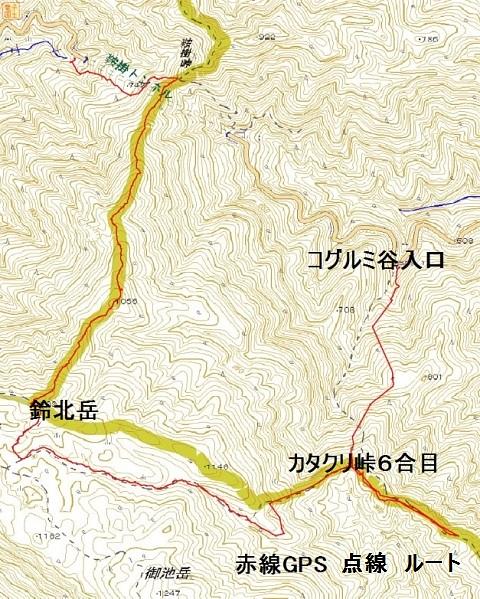 GPSの軌跡で辿ったルートをひらって見た。スタート地点から点線で示した従来のコグルミ谷ルートから逸れてしまっていた。途中、標高800m地点の高台状のところで青いテープ の目印を見つけ、それに導かれて一般道のカタクリ峠(6合目)に到達。この間、以前1時間15分程度であったが、道なき森林帯のルートファイティングを強いられ3時間強の時間を要した。